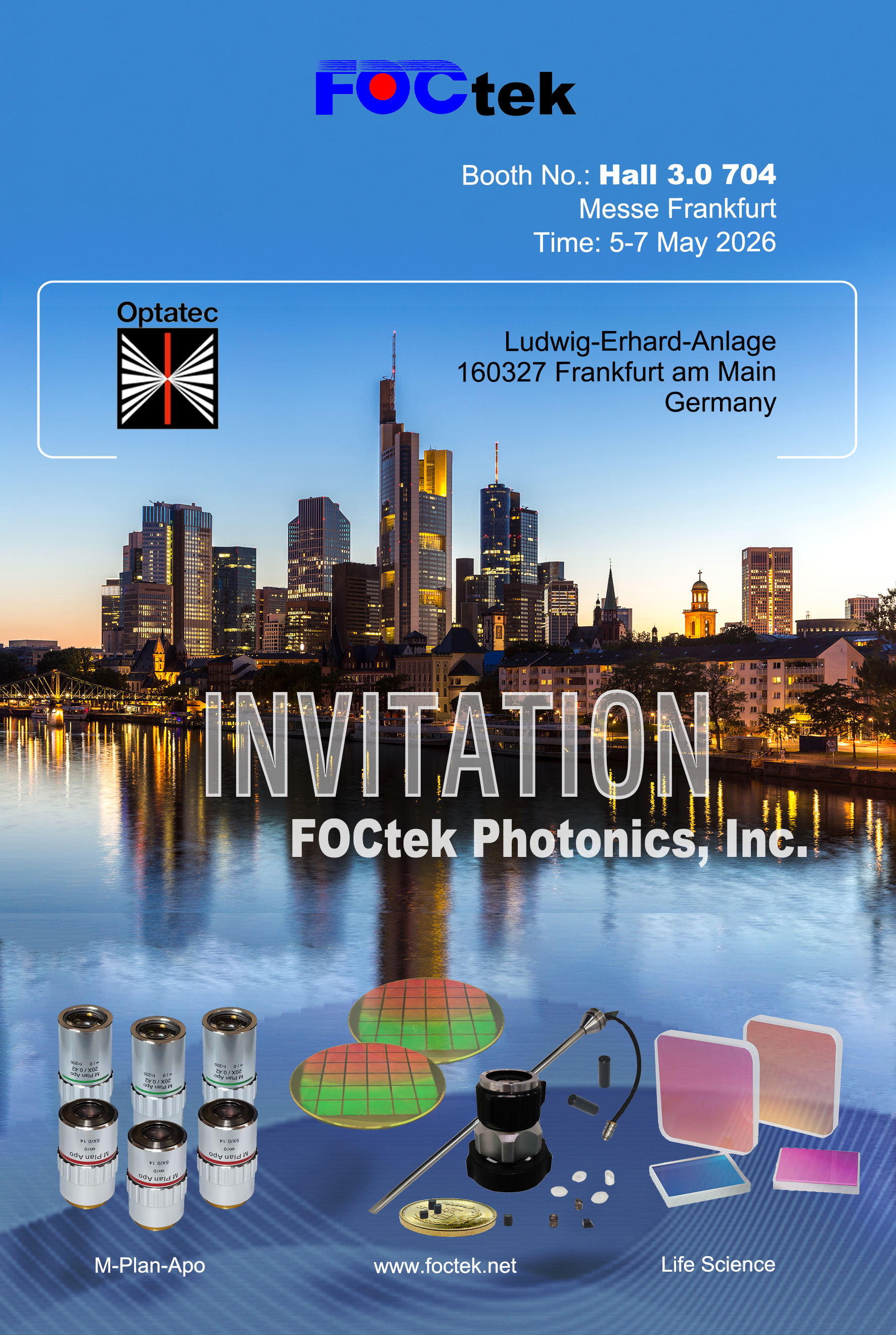 Foctek will participate in LASER World of PHOTONICS 2026 held at Messe Frankfurt Exhibition Centre in Frankfurt, Germany from May 5 to 7, 2026, showcasing optical solutions in fields such as biomedical optics, semiconductor optics, and industrial laser optics.